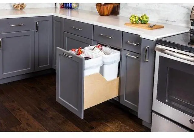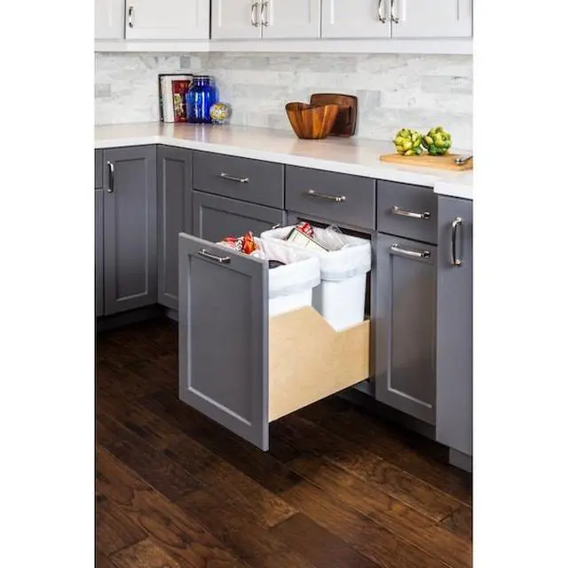 Neatly tuck away trash cans with this beautiful solid wood drawer box Soft-close trashcan pullout. Designed for cabinets with a 15" opening width but can accommodate a 14-1/2" opening. Ships fully preassembled with two 35 qt white plastic trash bins. Simply take out of box and screw to bottom of cabinet floor with four screws. Integrated 6-way adjustable door mounting brackets make installing the door quick and precise. Additional adjustment is available in the 4-way adjustable undermount slide clips.