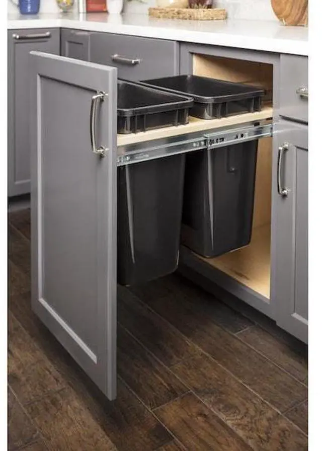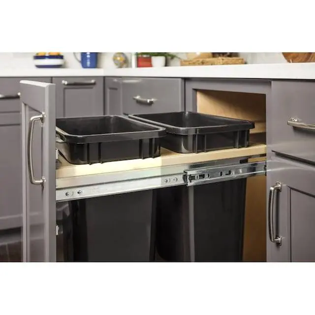 Get waste containers off the floor and hidden away in a cabinet with our double can top-mount waste container system. System features 100 lb Soft-close full-extension ball bearing slides and comes with a door-mounting bracket for attaching the cabinet door to the pullout. Plastic waste containers sold separately. This unit is designed to work with only 35 qt waste containers. Fits in a 15" cabinet opening.