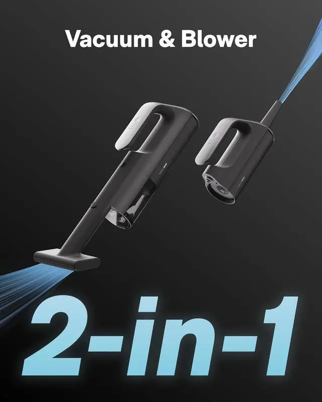 Vacuum & Blow in One Tool: More than a handheld vacuum cordless, it also works as an electric compressed air duster blower with the included blow nozzle. Easily clean hard-to-reach spaces like car vents, seat rails, dashboard gaps. The blow mode also helps inflate air sofas, air mattresses, and stoke fires during camping or travelmaking it a versatile tool for both everyday car or home cleaning and outdoor use