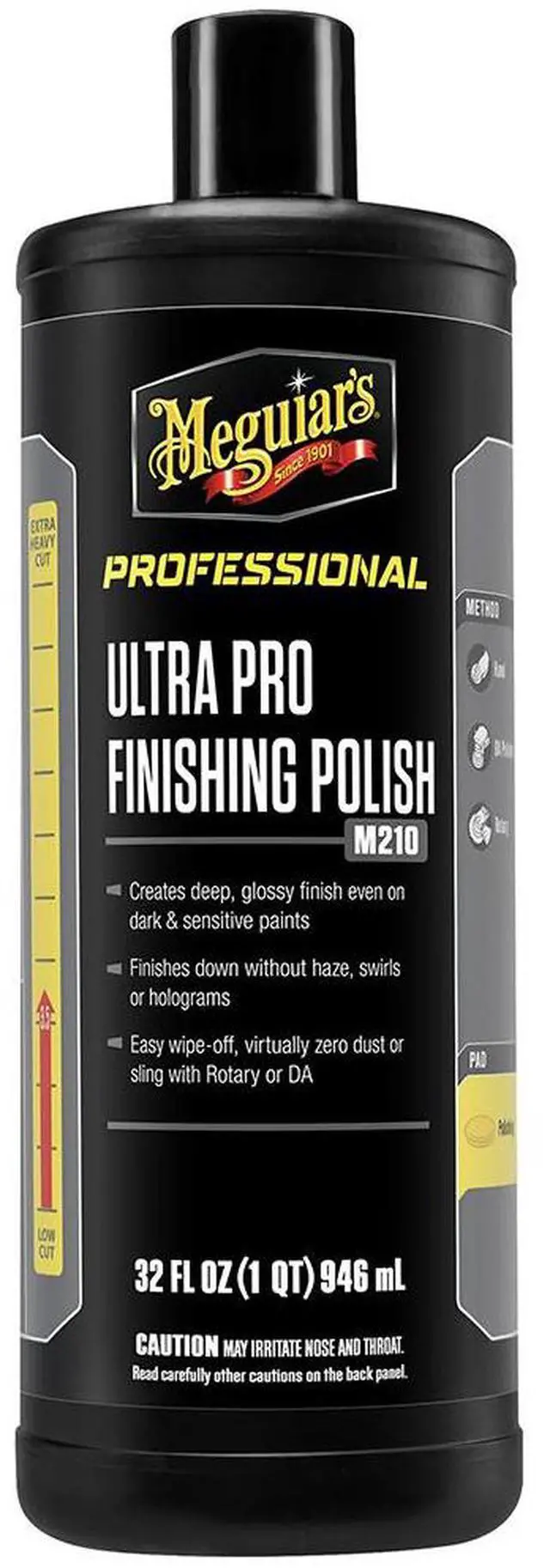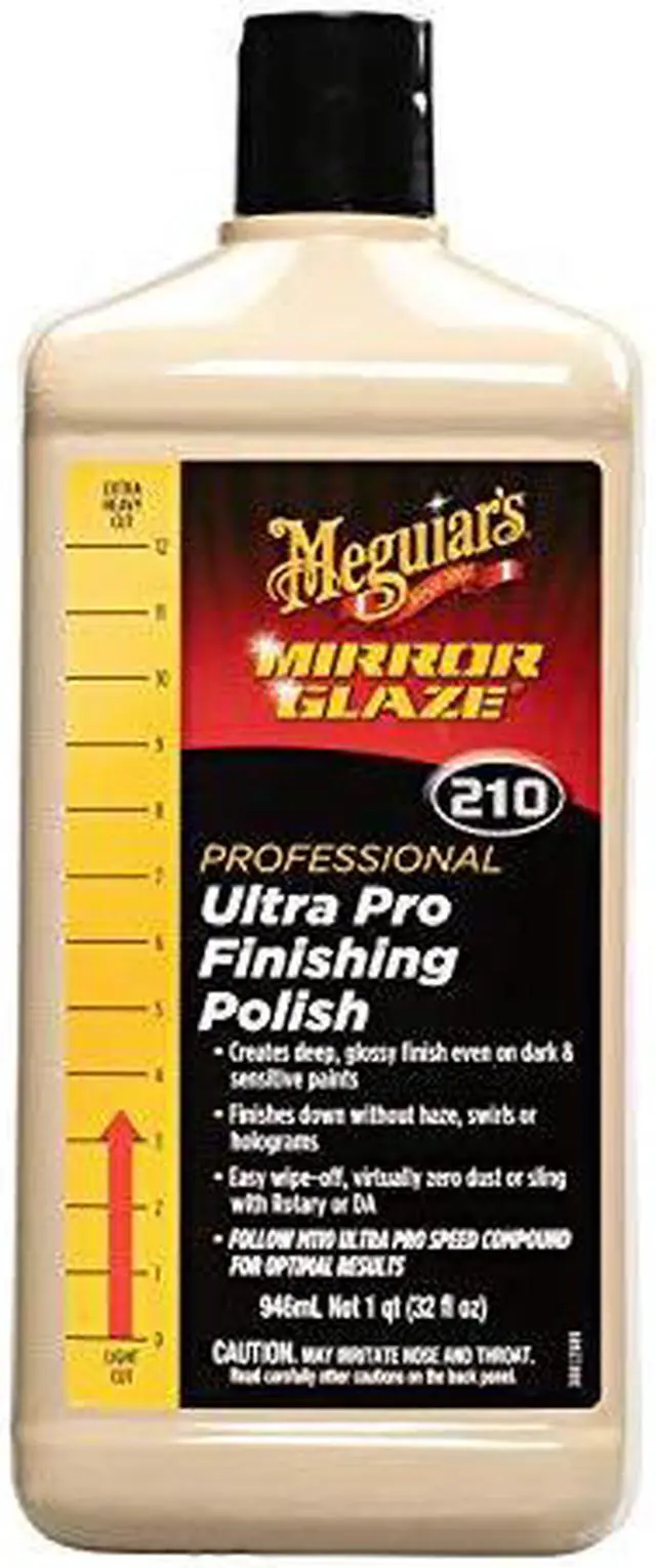 Ultra Pro Finishing Polish - 32ozMeguiar’s M210 Mirror Glaze Ultra Pro Finishing Polish is the next evolution in cleaner polishes that delivers amazing results, even on sensitive paints. Formulated with professional body shops and detailers in mind, this all-new formula quickly removes light paint defects like DA haze and Rotary swirls, finishing flawlessly without DA haze, swirls or holograms. Ultra Pro Finishing Polish rich polishing oils create a deep, glossy, brilliant finish, even when working with dark and sensitive paints. This exclusive formula is body shop safe and wipes off easily to reveal true results.