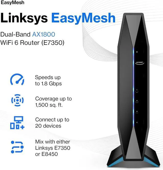 The Linksys E7350 WiFi 6 router covers up to 1,500 square feet* and handles up to 20+ devices at speeds up to 1.8 Gbps. This compact Dual-Band router lets you surf, stream, and game all at the same time to keep you connected to the things that matter most. With Parental Controls and separate Guest Access, your network will always remain safe and secure. Easily add devices to your network with a push of the WPS button.