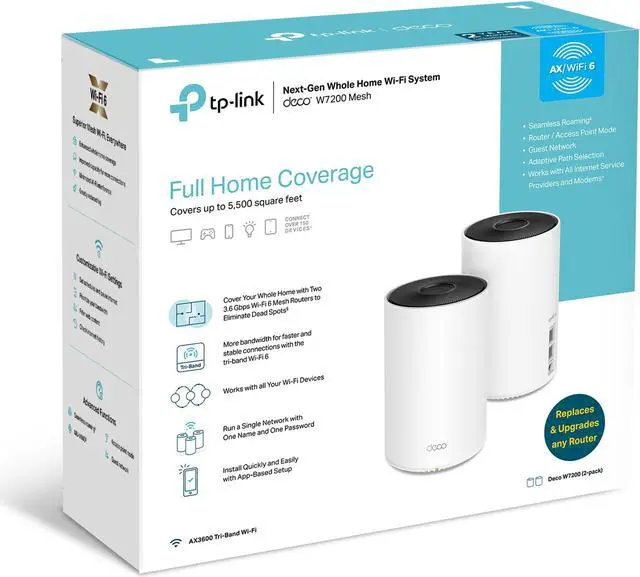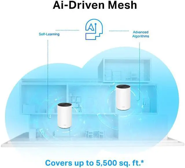 Upgrade to latest Wi-Fi 6 Whole Home Mesh WiFi System to experience faster speeds, greater capacity, and expanded coverage for homes all shapes and sizes. Two Deco units work together to provide tri-band speeds up to 3600 Mbps and coverage up to 5, 500 sq. ft. reaching every corner of your home. [1] [2] With Ai-Driven Mesh, your mesh system intelligently learns the network environment to provide WiFi unique to your home. [3] Connect up to 150 devices and seamlessly move from room to room without changing your WiFi network, or experiencing buffering or lag.