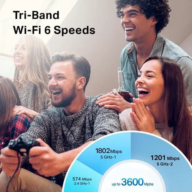 • Powerful Tri-Band Wi-Fi 6 Speeds: Experience blazing-fast speeds up to 3,600 Mbps, perfect for multiple 4K HDR streams, simultaneous online gaming, large downloads, video calls, and more.[1] [2]