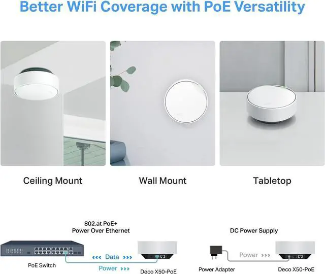 More Versatility with PoE-Each Deco router utilizes IEEE 802.3 at PoE (PoE+) to power the units via ethernet cable or via power plug. Take full advantage of your PoE+ switch to create a multi-Gig backhaul between your Deco routers (switch not included). You can now add Deco to more locations, and mount to areas like the ceiling for better Wi-Fi transmission