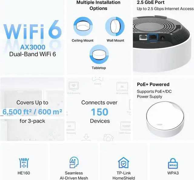 No More Buffering or Dead Zones-With coverage up to 6, 500 sq. ft and connections for up to 150 devices, the Deco X50-PoE provides seamless, high-performance WiFi 6, eliminating buffering and dead zones¹