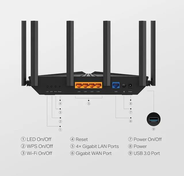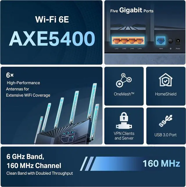 EASY SETUP: The tether app helps set up your network in minutes with clear visual guidance and keeps you in control even when you are not at home.   [1] Maximum wireless transmission rates are the physical rates derived from IEEE Standard 802.11 specifications. Range and coverage specifications are based upon test results under normal usage conditions. Actual wireless transmission rate and wireless coverage are not guaranteed, and will vary as a result of 1) environmental factors, including building materials, physical objects and obstacles, 2) network conditions, including local interference, volume and density of traffic, product location, network complexity, and network overhead and 3) client limitations, including rated performance, location, connection quality, and client condition.   [2] Use of Wi-Fi 6, Wi-Fi 6E, DL/UL MU-MIMO, DL/UL OFDMA, BSS Color, TWT, WPA3, 1024-QAM and HT160 requires clients to also support corresponding features.   [3] HomeShield includes the Free Basic Plan. Fees apply for the Pro Plan. Visittp-link. com/homeshieldfor more information.