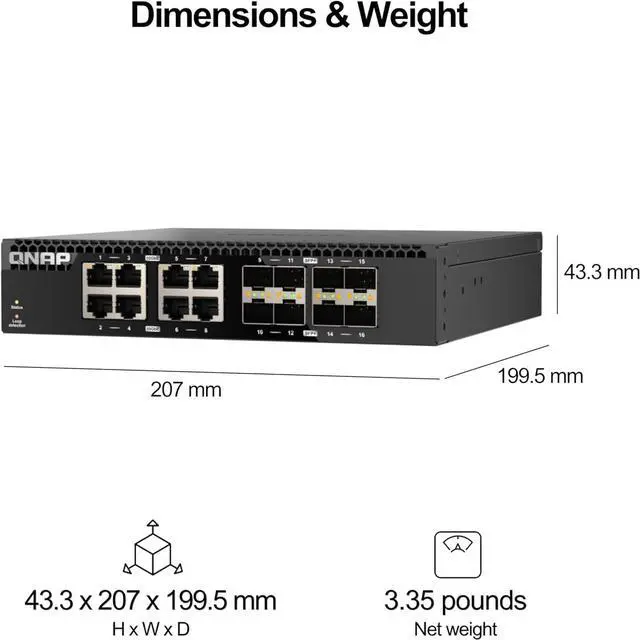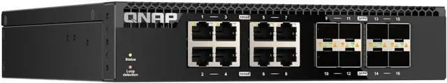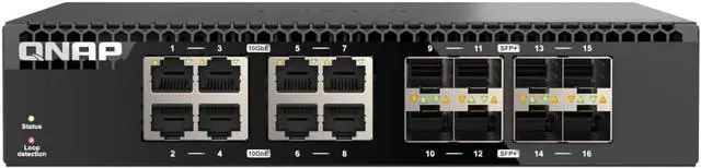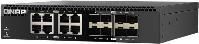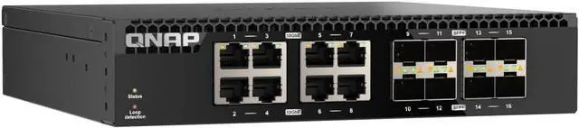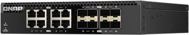 The QSW-3216R-8S8T provides eight 10GbE SFP+ ports and eight 10GbE RJ45 ports for connecting various devices and enabling high-speed networks. With SFP+ interfaces, Direct Attach Copper (DAC) cables can be used for connecting directly to SFP+ devices. You can also use RJ45 ports to connect 10GBASE-T/NBASE-T devices through RJ45 Category 6 (or better) cabling.