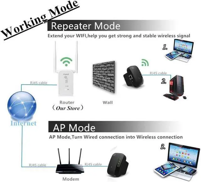 Two Modes: Repeater mode for stronger wireless performance and coverage and AP mode which creates a new WiFi access point.