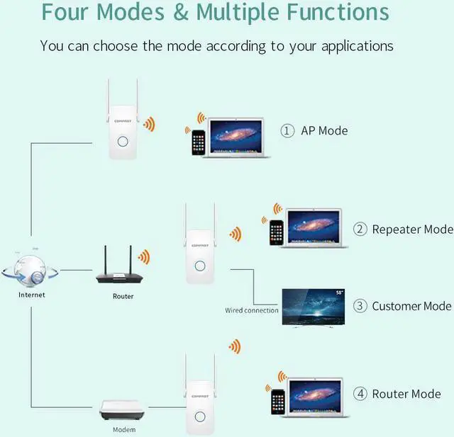 Repeater mode : WiFi extending ,WiFi transform to wired network ;