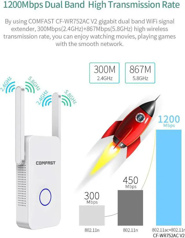 4.Enjoy high speed wifi ,wonderful partner of your gigabit router ; High speed wifi is a common and basic needs,Currently most of family use fiber broadband and gigabit dual band router.For use with gigabit dual band repeater,you'll have more smooth network experience;