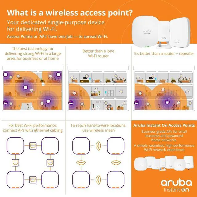 The Aruba Instant On AP25 Access Points are 100% backward compatible, allowing businesses to support multiple clients (Wi-Fi 6) and legacy (11a/b/g/n/ac) at the same time.