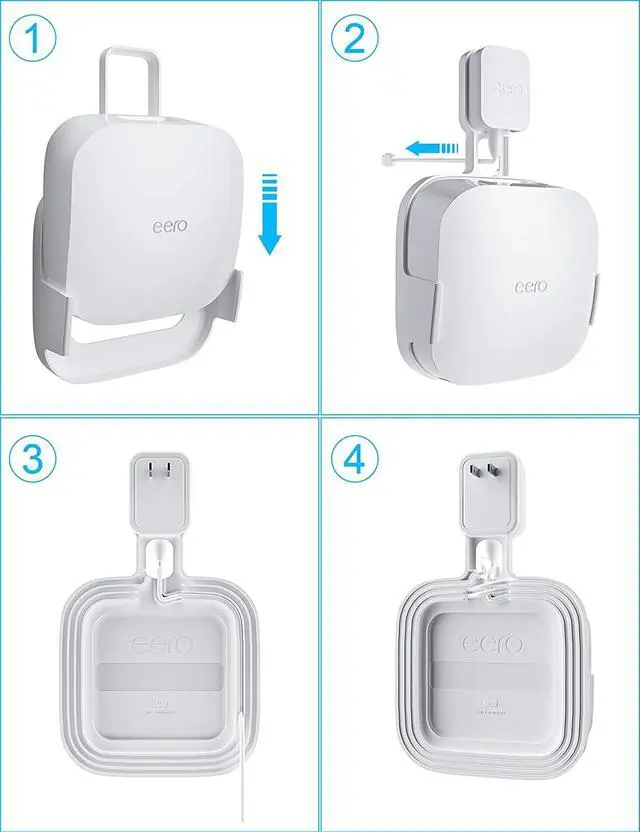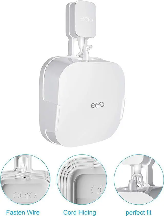 • Install without Screws: Put the eero pro 6 wifi on the wall mount bracket, The adapter into the holder head, Then take the cord into back groove. No need any tools and fin