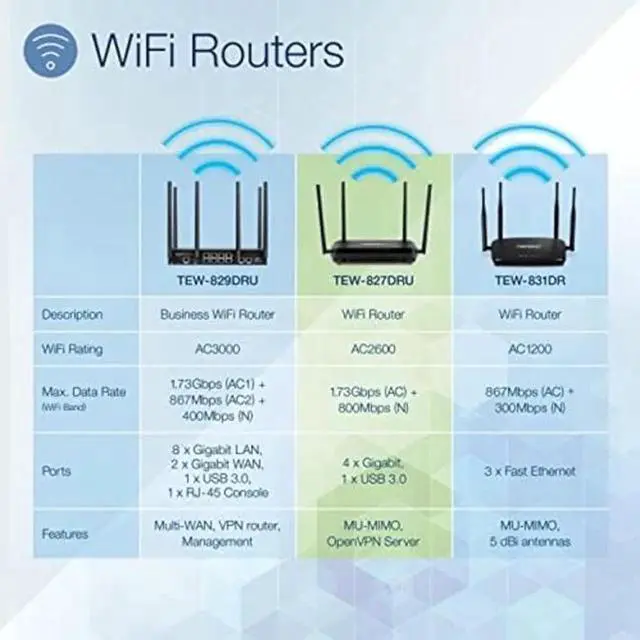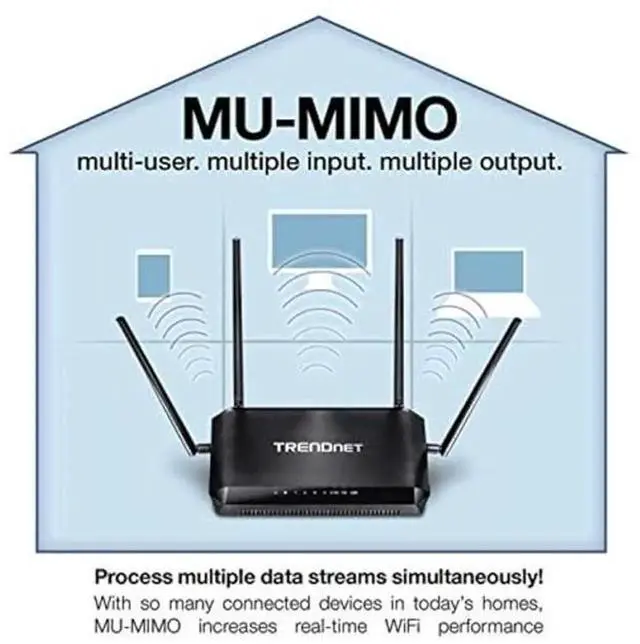 TRENDnet s AC2600 MU-MIMO WiFi Router, model TEW-827DRU, is built to perform in your busy connected home. This dual-band router generates two quad-stream WiFi networks a 1, 733Mbps WiFi AC and a concurrent 800Mbps WiFi N network. Further extend your network connectivity with this home WiFi router by using the gigabit Ethernet ports and the USB 3. 0 share port. With so many connected devices found in one home, you ll need a fast wireless router that can handle all the bandwidth from your entire household. MU-MIMO technology processes multiple data streams simultaneously, improving real-time wireless performance when multiple devices are connected to the network.