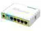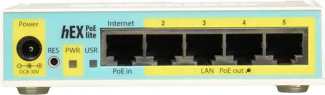 hEX PoE lite is a small five port ethernet router in a plastic case, it has a USB 2.0 port and PoE output. Ports 2-5 can power other PoE capable devices with the same voltage as applied to the unit. Less power adapters and cables to worry about! Max current is 1A per port, Ethernet ports are shielded. It is affordable, small and easy to use. With its compact design and clean looks, it will fit perfectly into any SOHO environment.