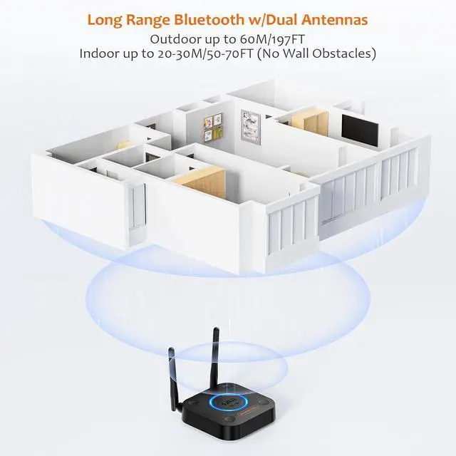 DUAL ANTENNAS&LONG RANGEWith dual antennas and class 1 Bluetooth technology, the 1Mii B06 Pro Long Range Bluetooth receiver can achieve a range of up to 197ft (60m) line-of-sight in the open air and up to 50-70ft (20-30m) indoors (without obstacles).
