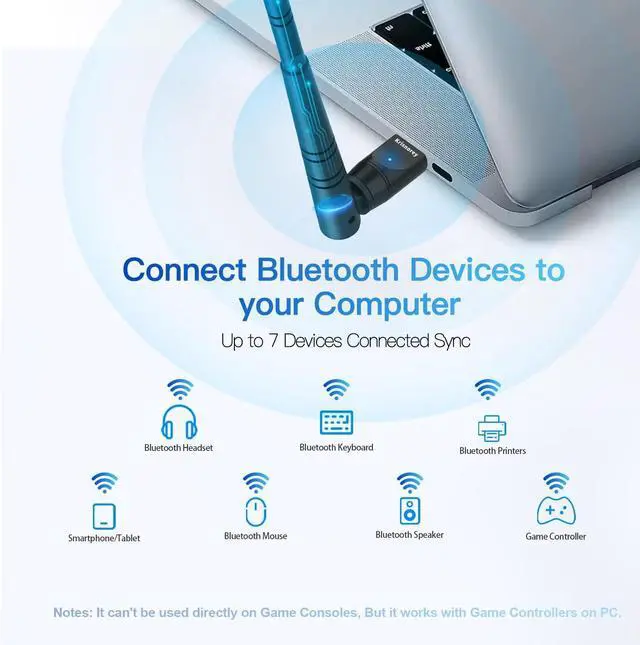 Up to 7 Devices Connected SYNC: Krisnorey USB Bluetooth adaptor for PC supports up to 7 different types of Bluetooth devices to be paired and connected at the same time without interfering with each other, including Bluetooth Headset, Speaker, Keyboard, Mouse, Game Controller, Printer, PCs, Laptop, smartphone and more. (Excluding 2.4G wireless devices like 2.4G wireless keyboard, mice).