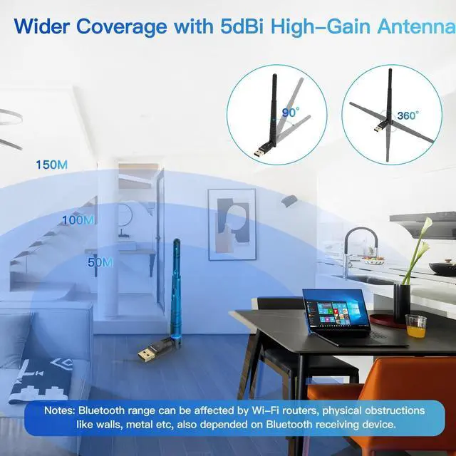 Extended Further Coverage: Engineered with 5dBi High Gain external antenna, providing a stronger and more stable Bluetooth connection with extended Bluetooth range of up to 492ft (150m) line-of-sight in open air and up to 164-328ft (50-100m) indoors. *NOTE: Operation range can be affected by Wi-Fi routers, Wireless TV adapters, physical obstructions like walls, metal obstacles etc. and also depended on Bluetooth receiving device.