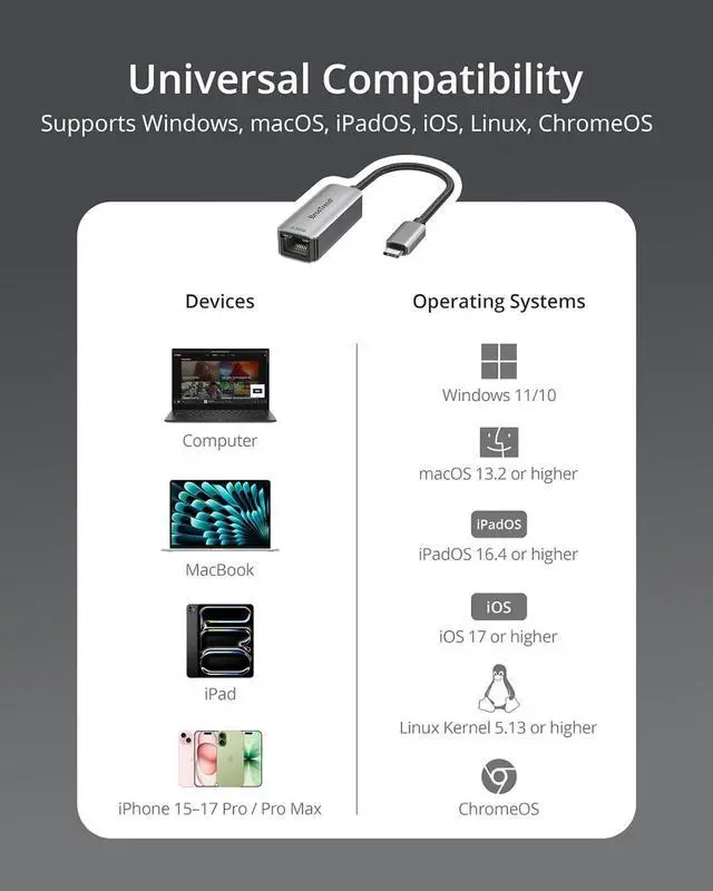 Wide OS & Device Compatibility: This Type C to Ethernet adapter works with Windows 11/10, macOS 13.2 +, iPadOS 16.4 +, iOS 17+, Linux 5.13 +, and ChromeOS. Compatible with devices with USB-C/Thunderbolt ports, such as MacBook Pro/Air, iPad Pro/Air, Dell XPS, Surface, Chromebooks, and more. Not compatible with gaming consoles