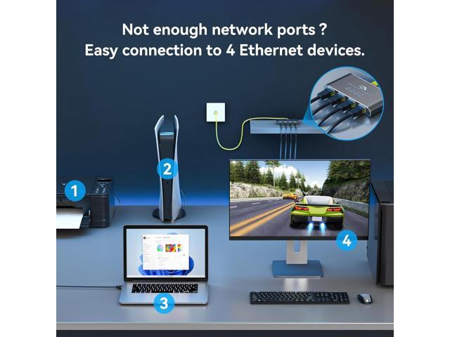 - Ethernet Splitter 1 to 4The Ethernet splitter 1 to 4 allows you to split one cable into four outputs. It is designed to address connectivity issues caused by insufficient wiring. It supports four computers to share a single Ethernet line simultaneously, providing a simple and convenient way to expand your network ports. (Note: This product comes with a USB power cable and must be connected to a power source during use.)