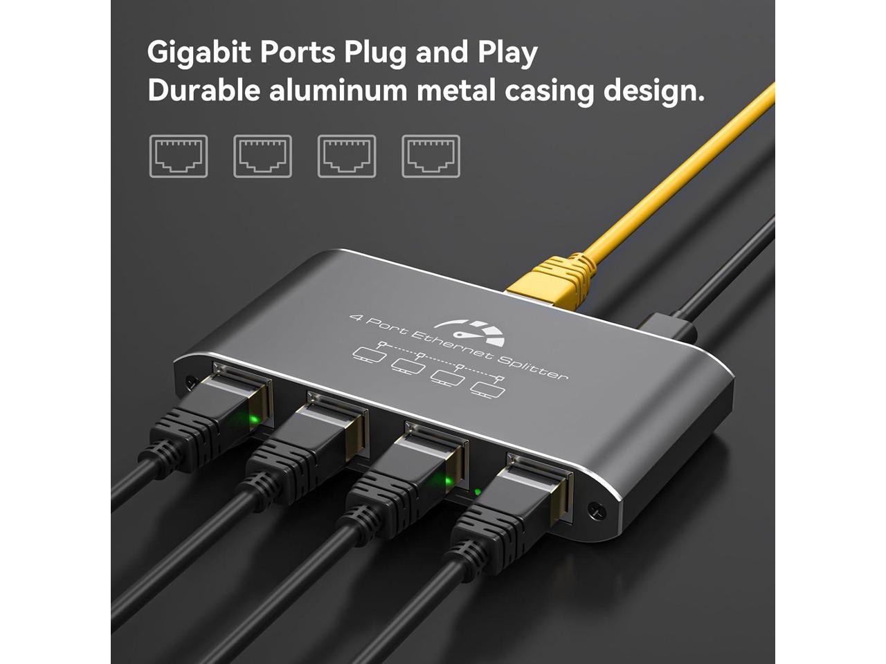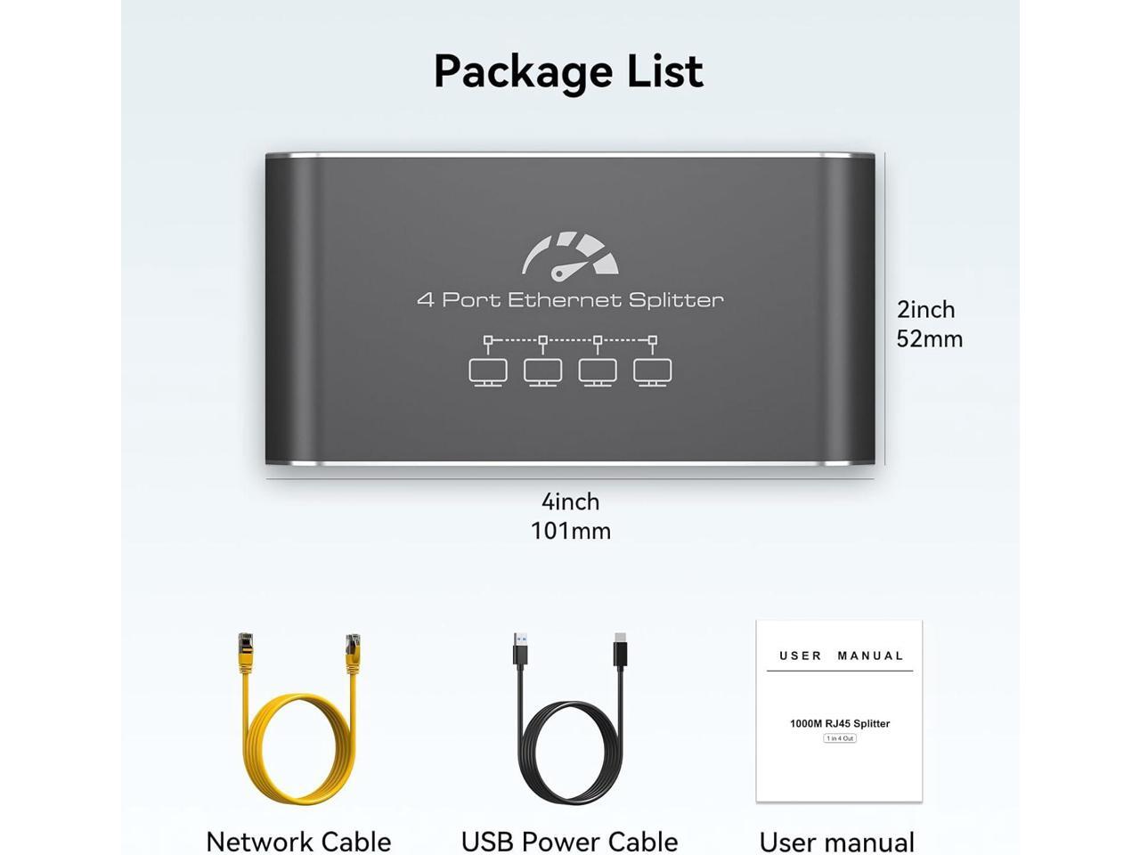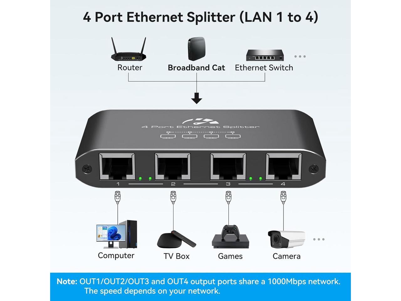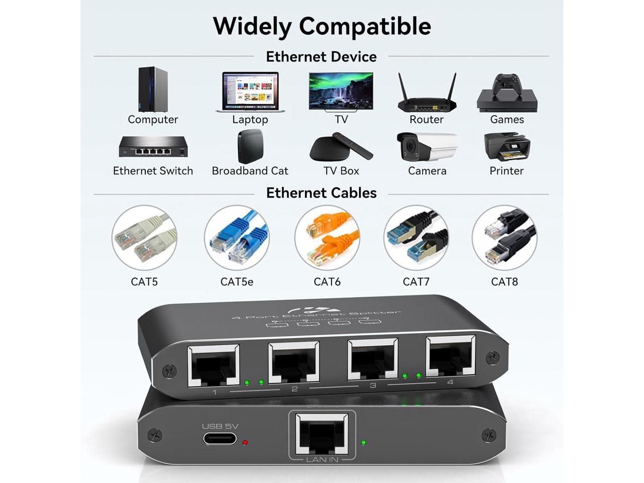 Ethernet Splitter 1 to 4 1000Mbps High Speed Internet Splitter, Gigabit Network Splitter with an Ethernet Cable and a USB Power Cable, 1 in 4 Out LAN RJ45 Splitter Work with Cat 6/7/8 Cable