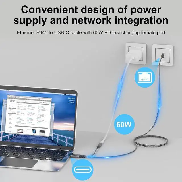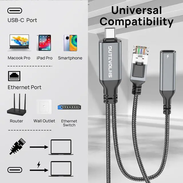 One: Dutevolns ethernet cable is equipped with usb-c female plug charging function, which can charge the device while you surf the Internet. Only one cable can bring two kinds of experiences, which is the best choice for your needsThe charging device you are using must support 60W and connect this cable to achieve 60W fast charging. If the charger you are using cannot reach 60W, then our speed is the highest speed supported by your charger