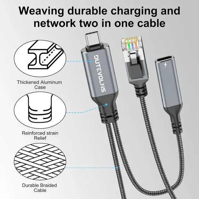 High quality materials: Dutevolns USB-C to LAN Cable uses pure copper wire for faster and more stable transmission, The type-c end uses high-quality aluminum shell with excellent texture and feel. Anti-rupture SR (strain relief) and nylon braided jacket provide stronger durability.