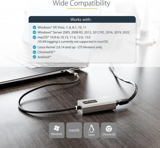 OS COMPATIBILITY: USB NIC adapter for laptop offers plug and play connectivity (no driver install required), works with Windows versions 7/8/10/11/Server, macOS 10.14 / 10.15 / 11.0 / 12.0 / 13.0, Linux distributions with kernel 4.11 to 5.9. 16 LTS, and Chrome OS