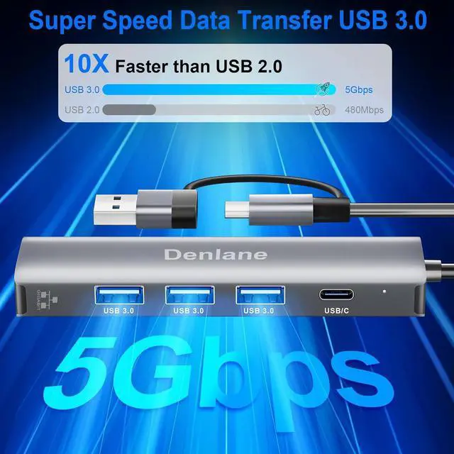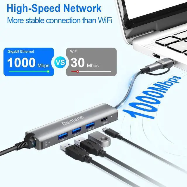 Organize Peripherals: Denlane USB hub/usb c hub totally has 4 USBA/USBC expansion ports, USB 3.0 provides 5Gbps data transfer speed. Backward compatible with USB 2.0 and 1.1. Ethernet hub allows you to get fast network, expand more peripherals, and easily and simply do what you like