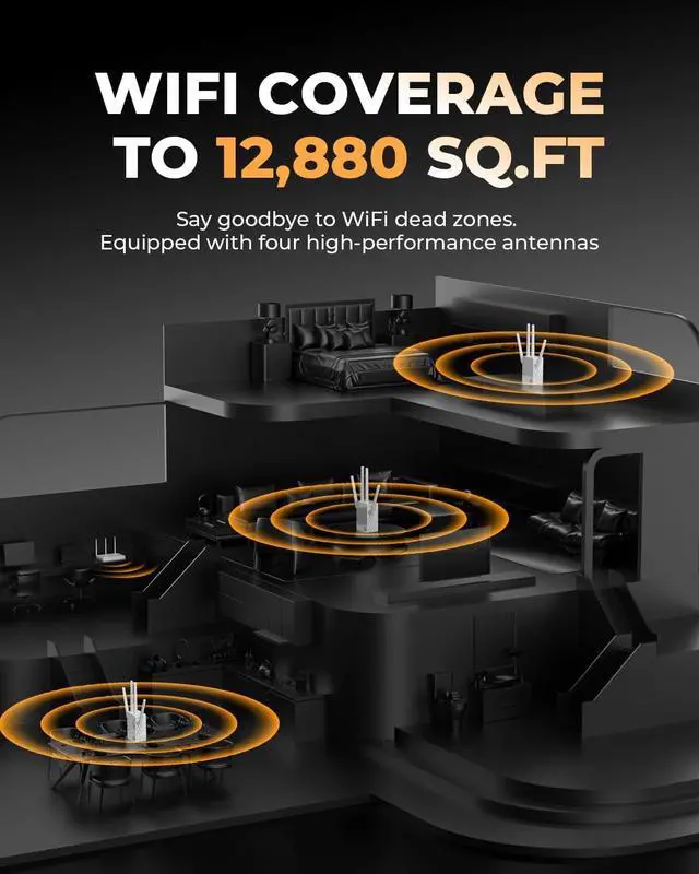 4 External Antennas: With 12, 880 sq. ft of coverage, these antennas blast through walls, floors, and even outdoor spaces. Whether youre working in the attic, hosting in the backyard, or binge-watching in the basementweak signals dont stand a chance.