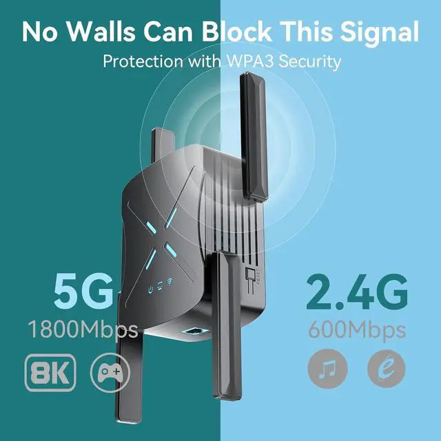 WiFi Extender Signal Booster: Enjoy blazing-fast speeds up to 1800Mbps, adopts 5GHz/ 2.4GH z dual-band technology and advanced chip processor. Our wifi extender ensures smooth gaming and 4K/8K HD live-streaming without delays or lags, providing fast and reliable signal for online VR, video conferencing