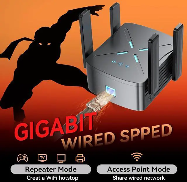 WiFi Booster with Gigabit Ethernet Port: Delivers lightning-fast wired/wireless speeds with anti-interference technology. This wifi repeater ensures full coverage and reliable performance for all devices. ldeal for large homes or offices-connect via Ethernet for stable high-speed access