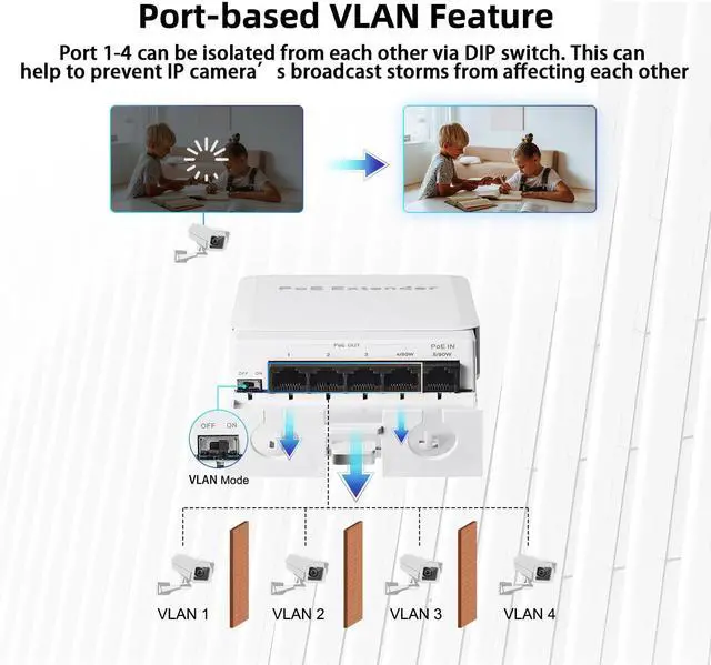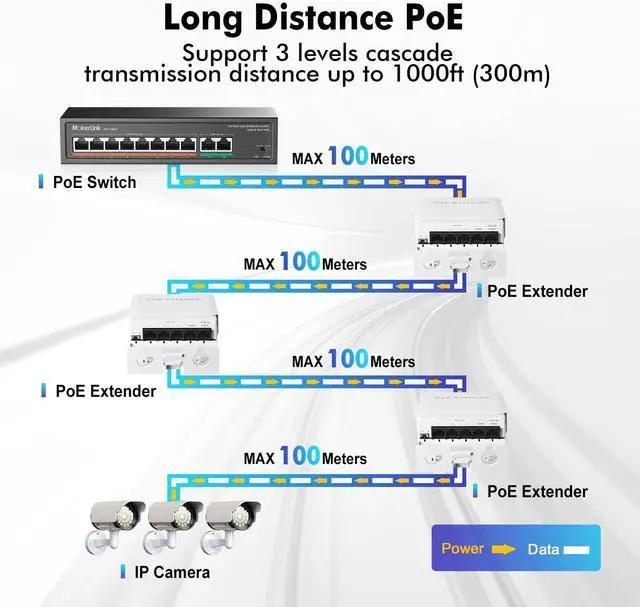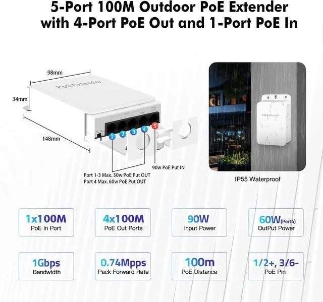 PoE Ports: Include 1 PoE In, 4 PoE Out, 10/100Mbps speed. POE transmission distance 100 meters.