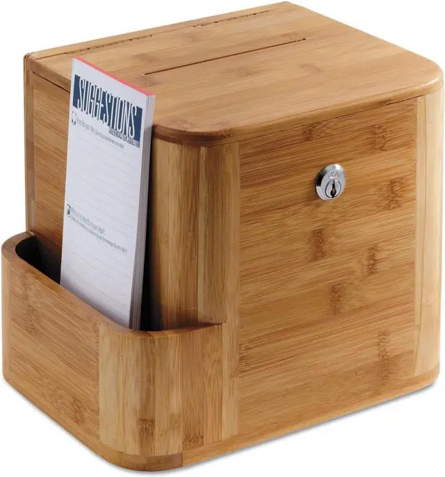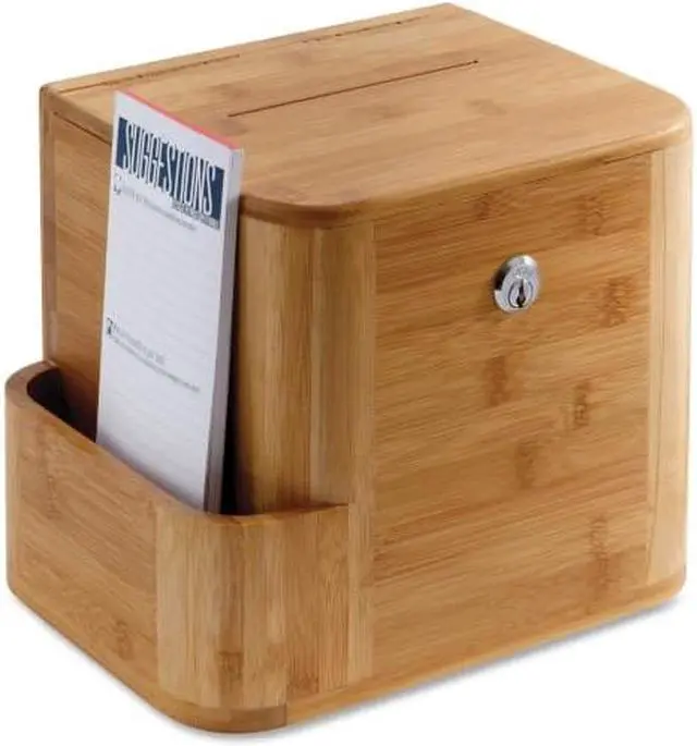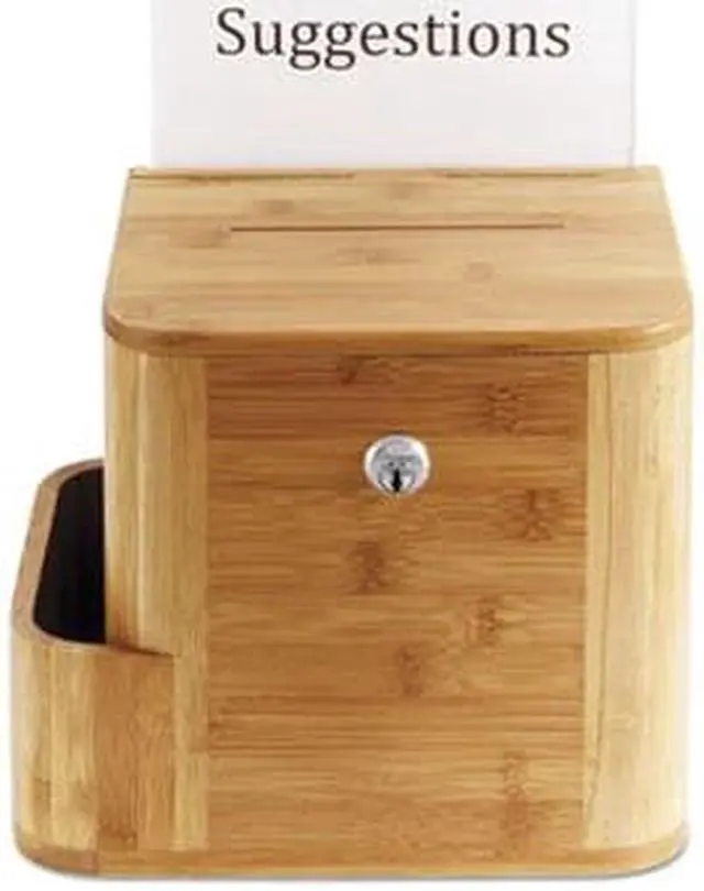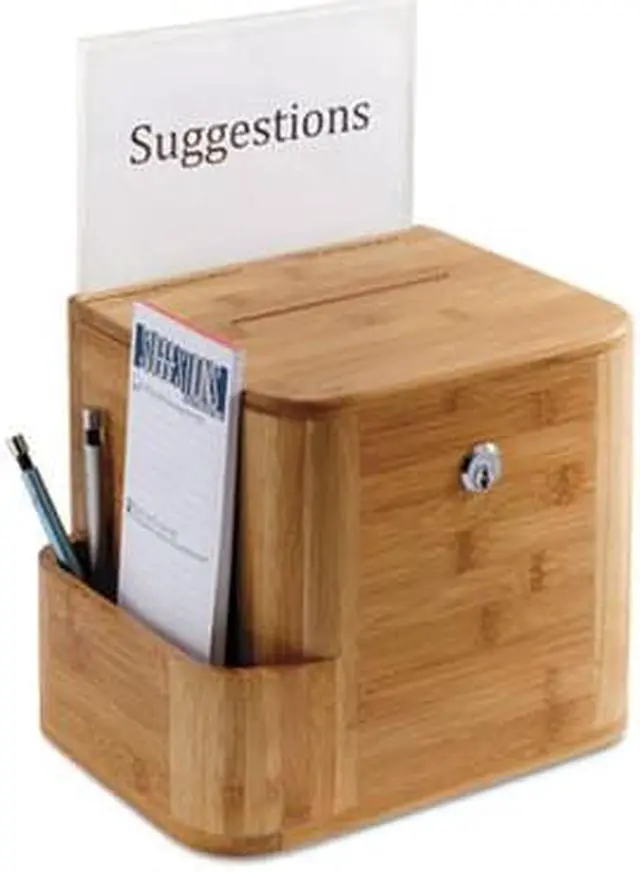 Get suggestions, ideas and recommendations with a look that's natural to every environment. Clear acrylic display allows a customized message with a 8 1/2" x 5 1/2" display. Side compartment stores pens and suggestion cards. Lockable and includes two keys.