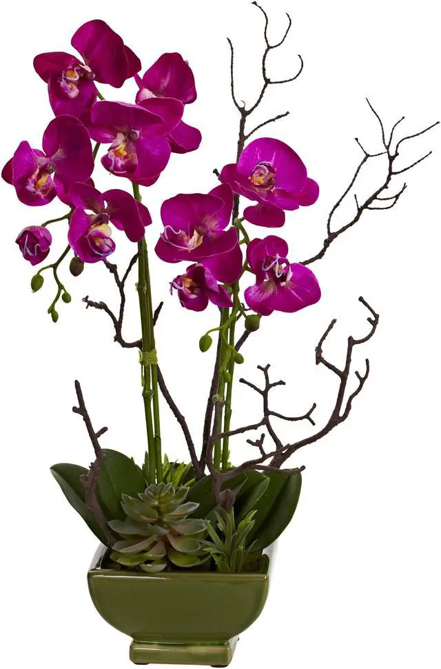 Here?s a striking reminder of the intricate magnificence of nature. The Orchid blooms softly rise up, surrounded by stems reaching in every direction, giving the distinct look that Orchids are known for. But the base of this arrangement is a selection of green succulents, providing the perfect accompaniment to the delicate beauty that dances above. Perfect for any room or office, this delightful arrangement also makes a great gift.