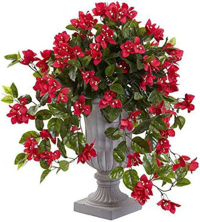 This bougainvillea arrangement can be used in all climates and seasons since the artificial vines and leaves require no care. spilling over the gray urn, these bright flowers make the perfect statement in any space. pair two on columns for a victorian feel or place in the dining or sitting areas to bring the tropics indoors. gray urn is included in this arrangement. adjustable stems and leaves offer a unique design element to this full, lush arrangement.