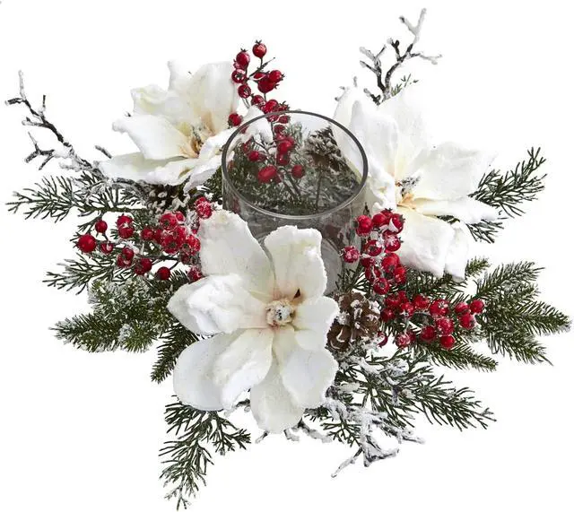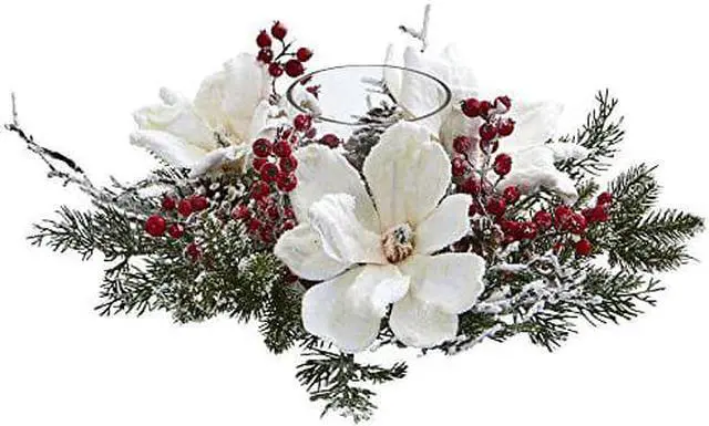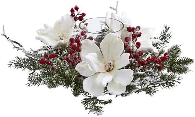 The warmth of candlelight on a cold winter's night can be yours with this faux magnolia candelabrum. Enjoy the flickering candlelight surrounded by white blooms, green pine and red berries. Frosted faux snow completes the winter feeling.