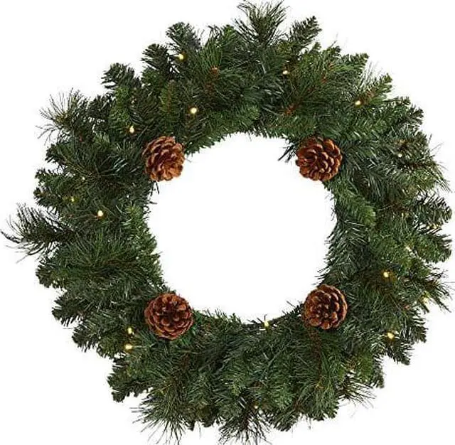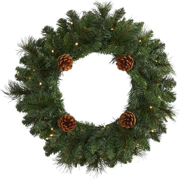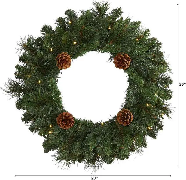 Light up your favorite seasonal accents while adding serious curb-side appeal with this artificial Christmas wreath intricately designed from realistic looking pine foliage in a palette of seasonal evergreens, carefully accented throughout with faux pinecones that look incredibly realistic. Arriving pre-strung with 35 LED lights to effortlessly illuminate either a wall or door, this 20" (in circumference) decorative wreath makes for an inviting accent and will undoubtedly transform any entrance all throughout the holiday season.