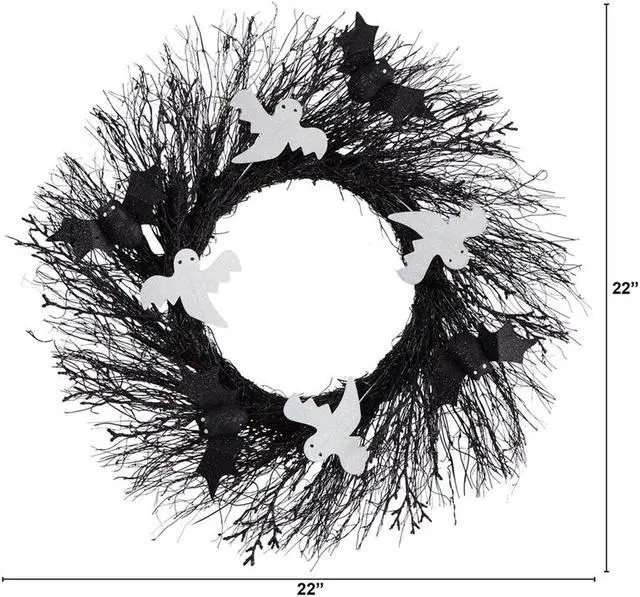 Create your own mini haunted house with this Spooky Bats and Ghosts Halloween Wreath. Black twigs are accented by white and black spooky bats adding a scary touch. Stand out this Halloween season by hanging in any space in need of a festive touch. With a diameter of 22' house in any door or bare wall. Makes a fine gift too.