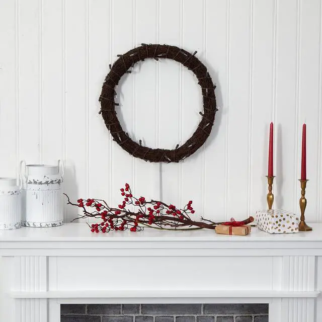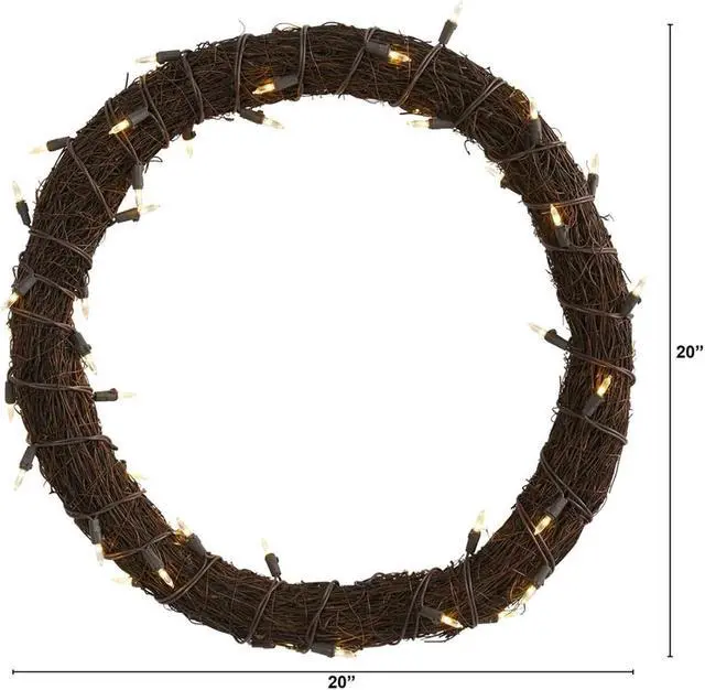 Add a little decorative accenting to an empty wall or doorway with the help of this artificial vine wreath. Intricately designed with a twig-like base, this decorative wreath comes already pre-strung with 50 warm white LED lights to give a soft, illuminating glow to an otherwise bare space. Great for year-round display, this 20" (in circumference) faux vine wreath would make for an inviting accent and would inject front-door appeal all year round.