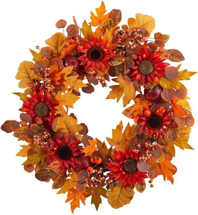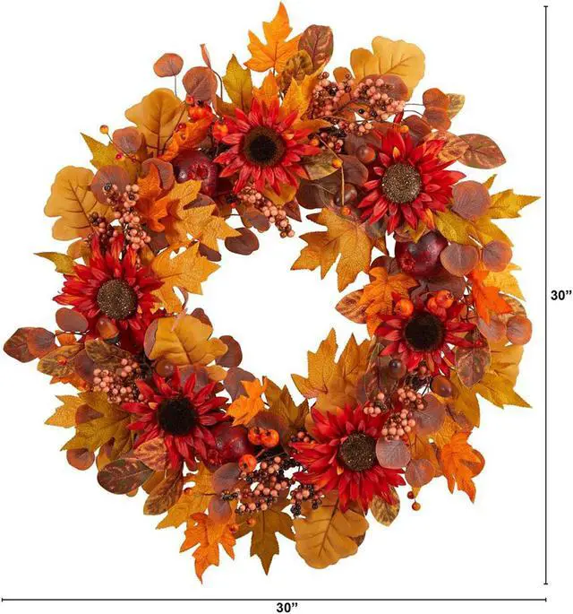 Welcome the beautiful colors of fall in your home with this Harvest, Acorn, Sunflower, and Berries artificial wreath. Assembled in the USA from high-quality materials, our intricate attention to detail is displayed with the vividly colored flowers accented by the light-hued berries and sunflowers' texture. With a diameter of 30", show your true colors in any setting. House in a bare wall, empty door or bathroom.