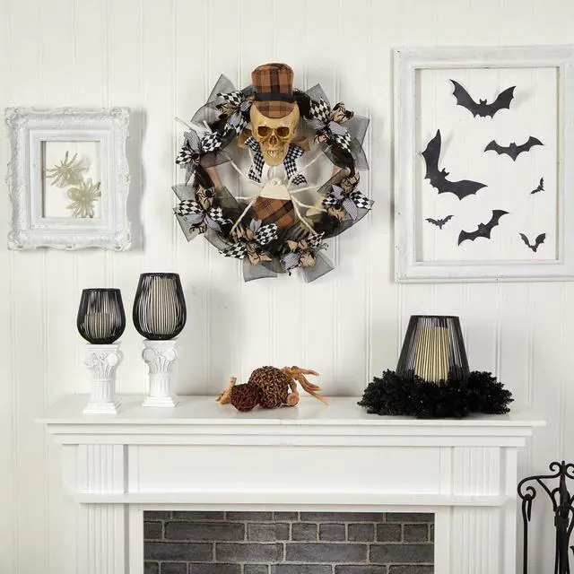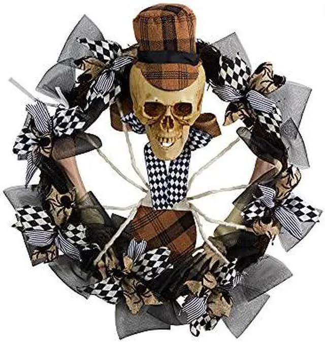 You can still be scary but chic at the same time with this Skull and Ribbons Halloween Wreath. Ribbons are accented by a skeleton with a top hat and a spider with the same patterned hat, bring a fun yet festive look in any space. With a diameter of 24" hang in any bare wall or door. Perfect as a gift or for a fun spooky night at home.