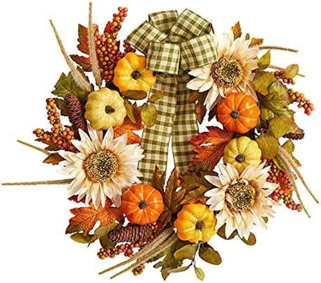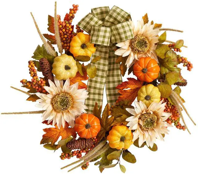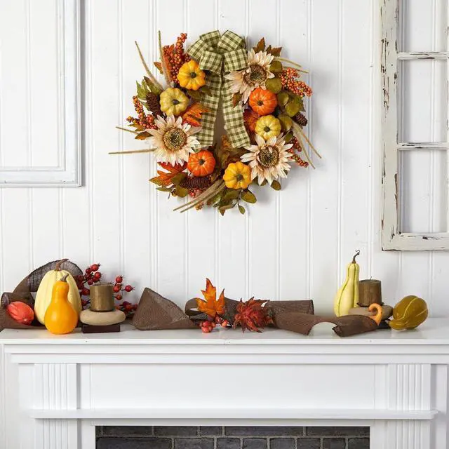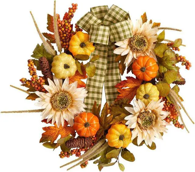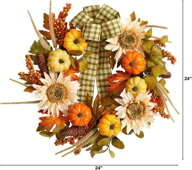 Looking for country chic vibes? Bring cozy, chic vibes to your space with this Fall Sunflower, Pumpkin Artificial Wreath. Sunflowers sit on a bed of maple leaves in a palette of fall foliage-inspired hues are accented by berries and pinecones for texture. Handcrafted from fine materials, we guarantee this artificial wreath will last many years. With a diameter of 24" house in any bare wall or door. Can be used in a farmhouse inspired home or during Thanksgiving