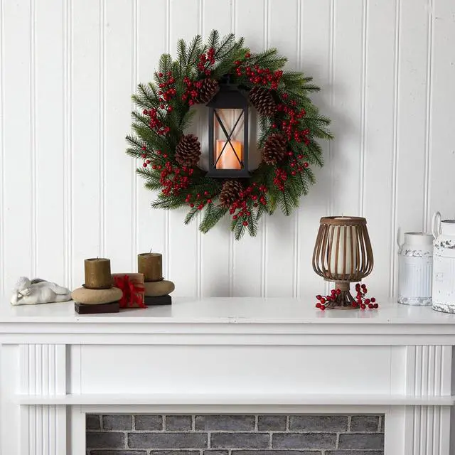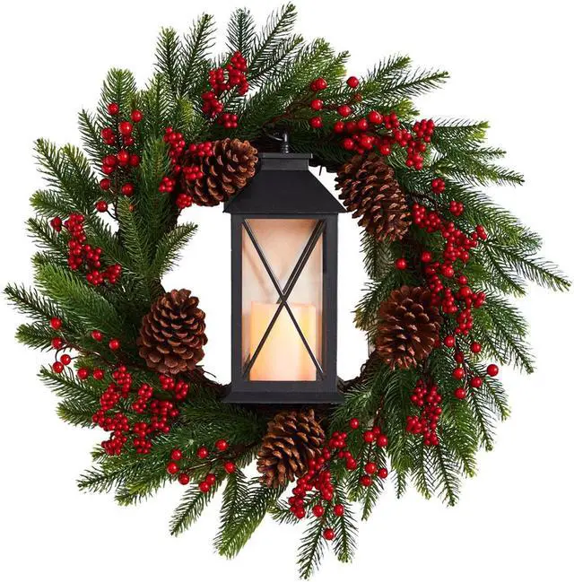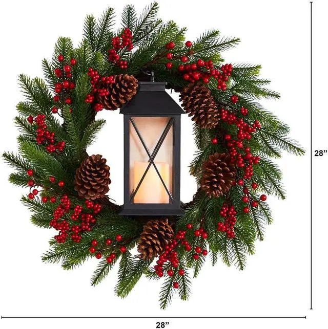 Love wreaths? Take your Christmas Decor to the next level with this Christmas lantern artificial wreath. Designed from high-quality materials, evergreens in a counterclockwise motion are accented by pinecones and berries. To make things brighter, a lantern in a dark finish can house your favorite candle. With a diameter of 28", set the scene for an intimate night with friends. Illuminate a bare wall.