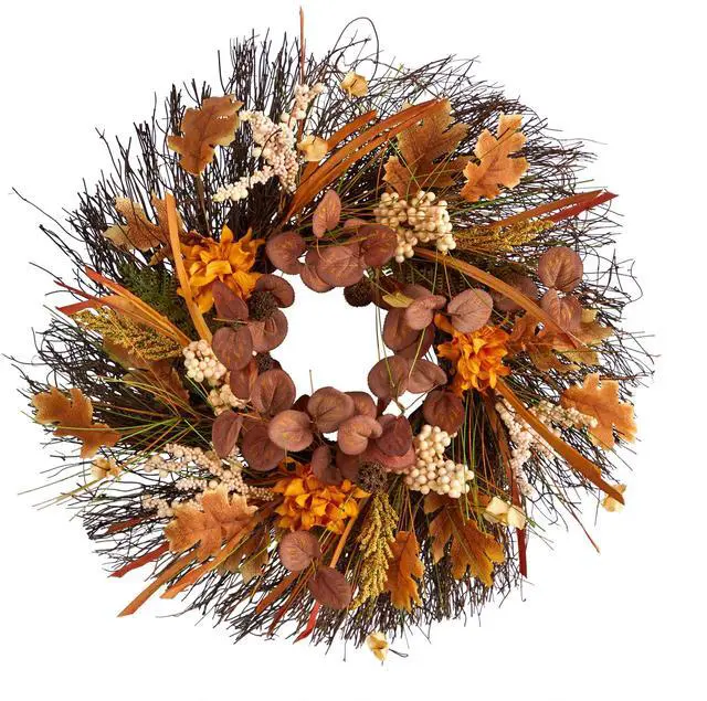 This Dahlia and Berries Artificial Fall Wreath makes it easy to faux in love with fall. Bring the fall foliage home with a modern wreath that is accented by dahlias and berries, bringing texture and color to any area. Hang this 22" in diameter wreath in any bare wall or door.