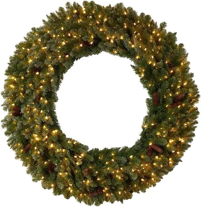 Add the WOW factor to your holiday Decor with this flocked artificial Christmas wreath intricately designed from realistic looking pine foliage in a palette of seasonal evergreens flocked in a coat of faux-snow, carefully accented throughout with faux pinecones that look incredibly realistic. Arriving pre-strung with 300 clear LED lights to effortlessly illuminate either a large wall or door, this 5' (in diameter) decorative wreath makes for an inviting accent and will undoubtedly transform any entrance all throughout the holiday season. Perfect for a large space in need of some holiday cheer.