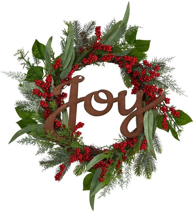 Nothing says Christmas like a classic Christmas artificial wreath. Soft-hued evergreens add an instant sense of freshness and are accented by faux berries so lifelike you'll think they're real. Spread holiday cheer with the joy lettering across the wreath. With a dimension of 24", house in any bare wall or door.