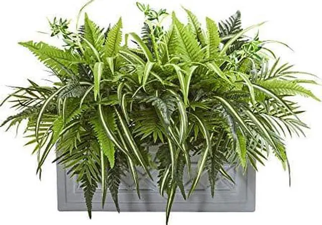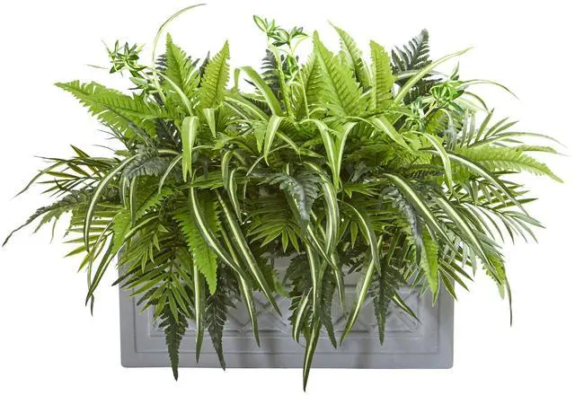 • Mixed Greens and Fern Artificial in Stone Planter