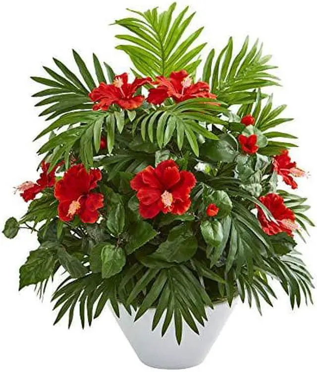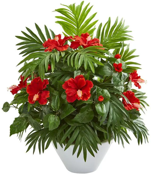 • Hibiscus and Areca Palm Artificial Plant in White Bowl