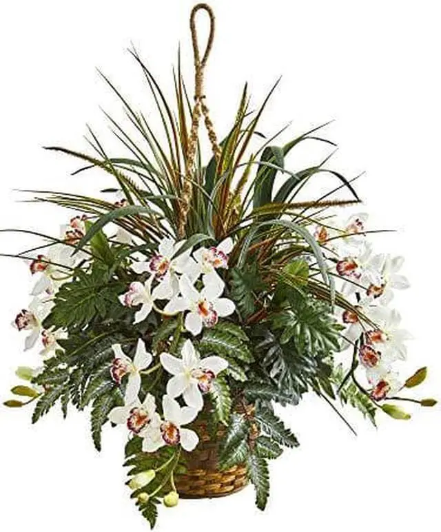 • 29 Cymbidium Orchid and Mixed Greens Artificial Plant Hanging Basket
