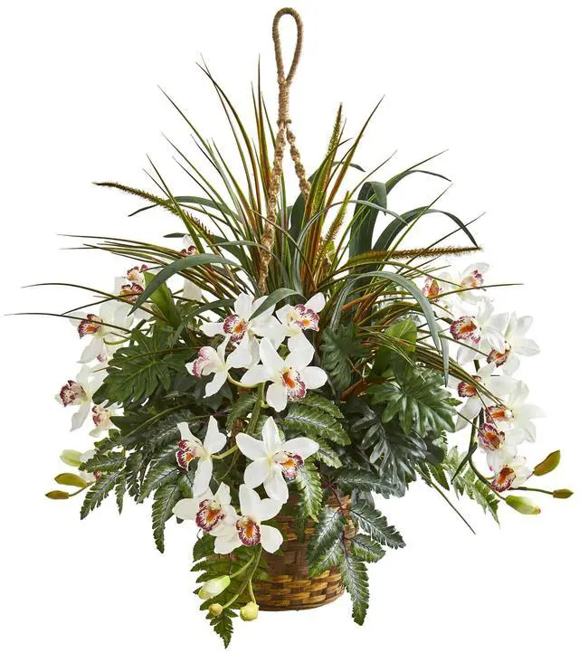 29 Cymbidium Orchid and Mixed Greens Artificial Plant Hanging Basket